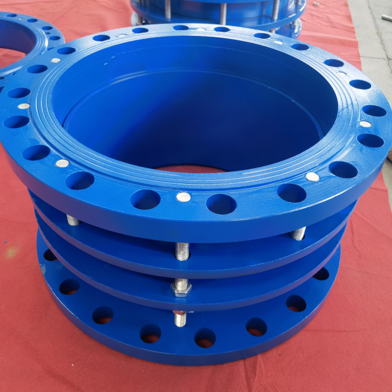調試雙法蘭傳力接頭時,應先鬆開中間的壓蓋螺母。此時密封圈處於停止工作狀態,短管開始調整。調整尺寸以1/2δL為標準,然後開始調整雙法蘭傳力接頭。同時,取下螺栓的第一個螺母,將螺栓頭對準管道的法蘭孔,然後安裝管道的一端。
